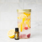One of my favorite and most simple ways I use essential oils in the kitchen is by adding one-to-two drops of Lemon essential oil to a glass of water (glass or metal cup, or water bottle only), or a fruit smoothie. Lemon helps support healthy digestive function and a provides boost of sunshine energy. Not to mention the soft scent and taste of lemon essential oil is delicious!